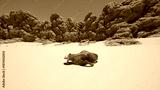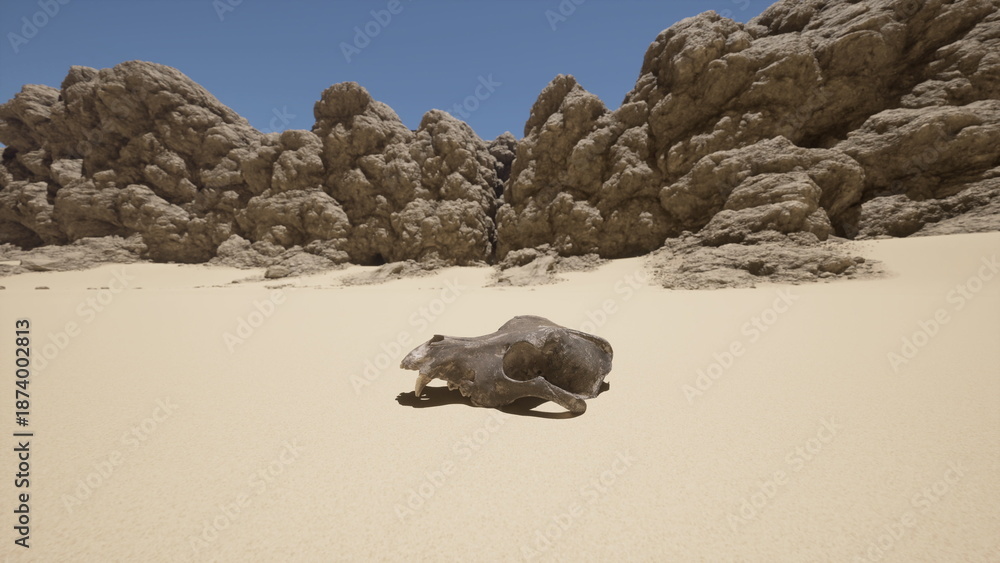 A stark desert scene features a skull resting on the sunbaked sand, surrounded by rugged, weathered rock formations under a clear blue sky. The vastness highlights the isolation of the skull.