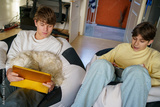 Two teenager boys doing school homework on tablet. Teen children learning at home.