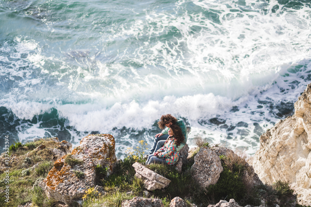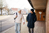 Two teenager boys, best friends walking to school. Teen children using smartphone.