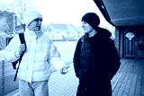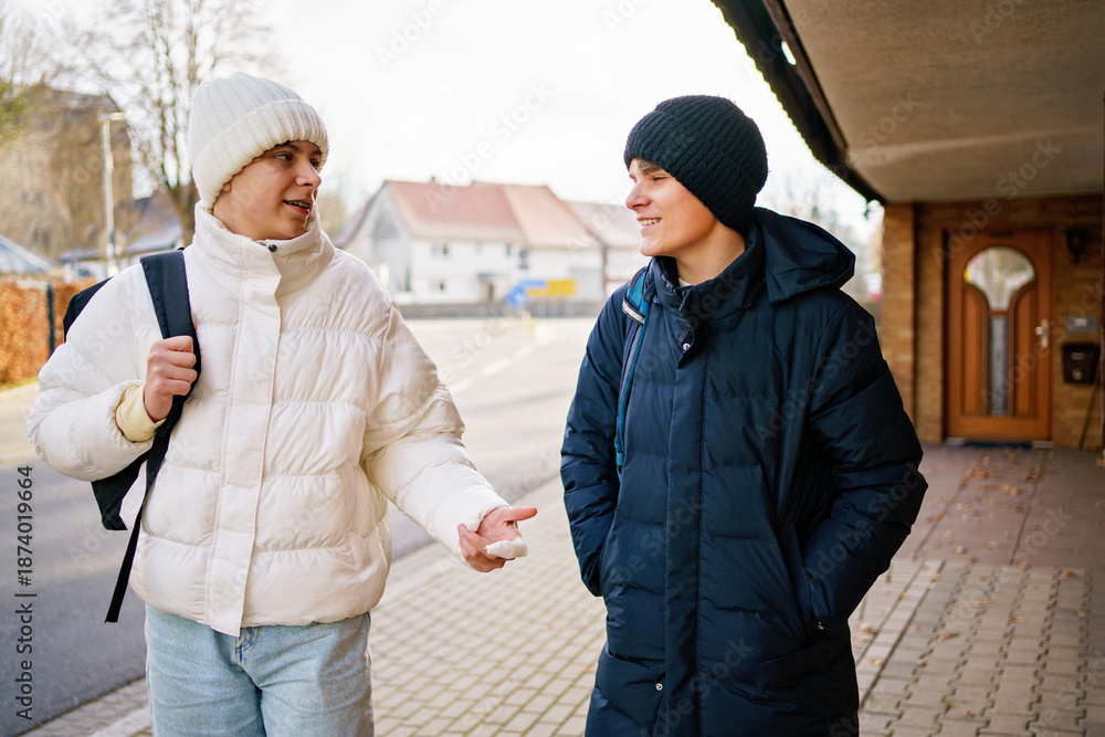 Two teenager boys, best friends walking to school. Teen children using smartphone.