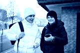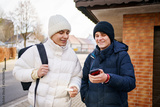 Two teenager boys, best friends walking to school. Teen children using smartphone.