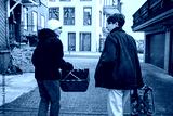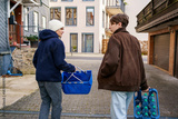 Two teenager boys, best friends on way to supermarket for shopping and changing mineral water drinks box.
