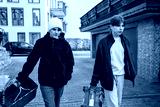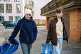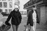 Two teenager boys, best friends on way to supermarket for shopping and changing mineral water drinks box.