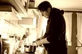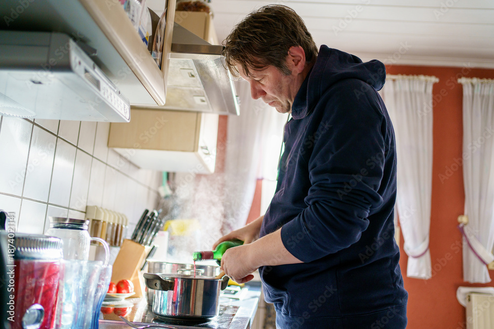 Man cooking meal for family lunch with pasta and meat in domestic kitchen and serving table