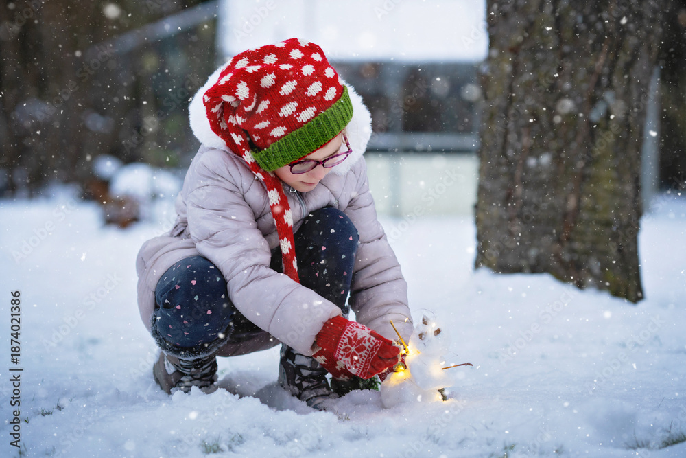 Little girl crouching in the snow, holding a small glowing handmade snowman outdoors, enjoying a calm winter moment, cozy real life childhood scene