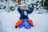 Little girl enjoying a day out playing in the winter forest. Portrait of cute preschool child with glasses with sled. Kid having fun.