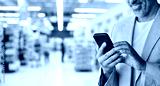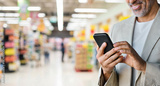 Happy man standing using online grocery shopping with delivery app on smartphone. Smiling male customer user holding cell phone in hands buying products or goods in application on cellphone. Banner ad