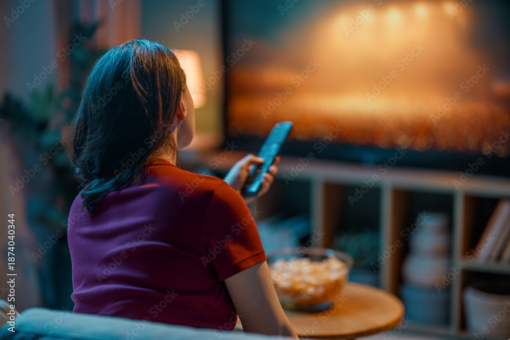 woman watching TV at home.