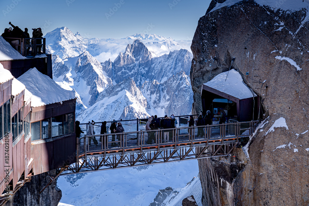 People on bridge on Aiguille du Midi mountain, Alps, France, Chamonix-Mont-Blanc. Picturesque mountain landscape with tourists.