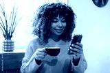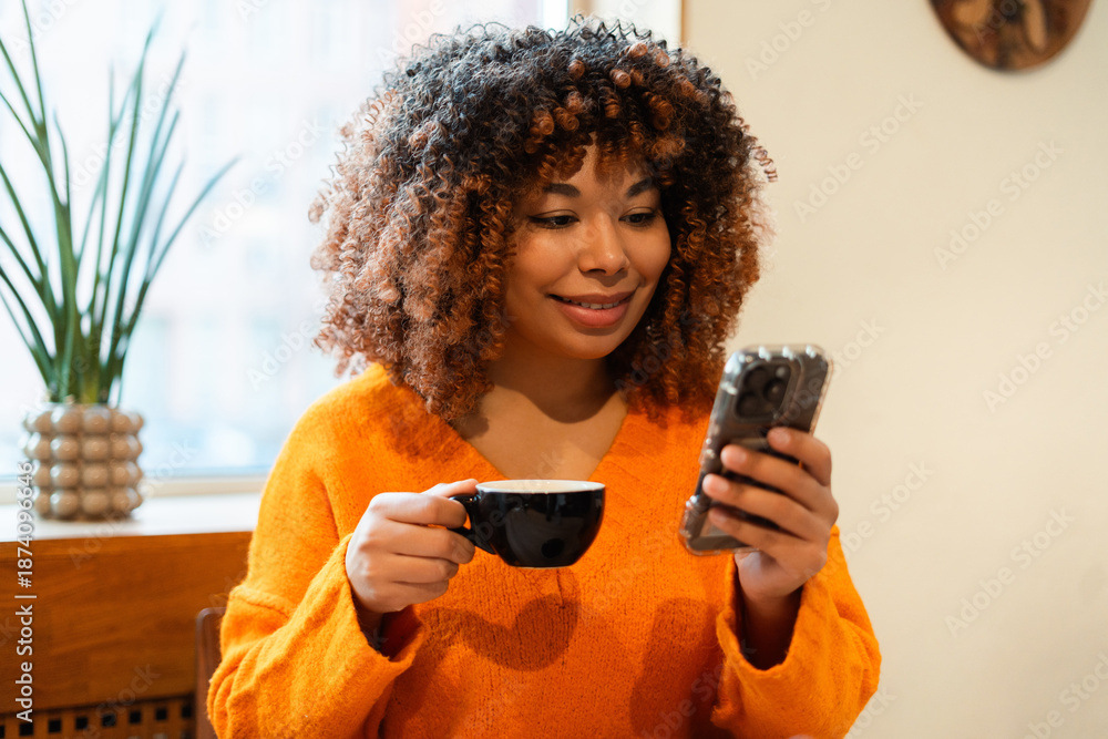 Young woman enjoying coffee and connecting with smartphone in a cozy cafe