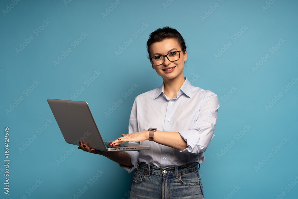 Smart happy IT woman holding using on laptop pc computer chatting online isolated on blue background