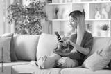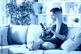 Blonde woman using smart phone sitting on a sofa