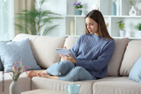 Serious woman in blue taking notes on paper notebook