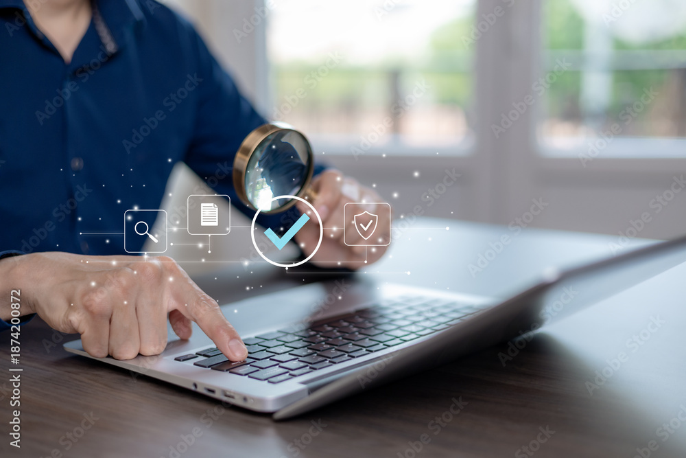 Business verification and data review concept with magnifying glass and check mark on laptop. Digital search, audit, compliance, security validation, and quality control for online systems and modern