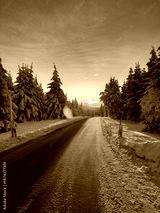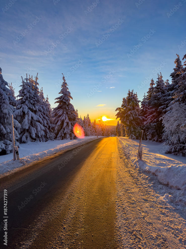 winter road in the mountains with sunset on the ore mountain saxony east germany vertical