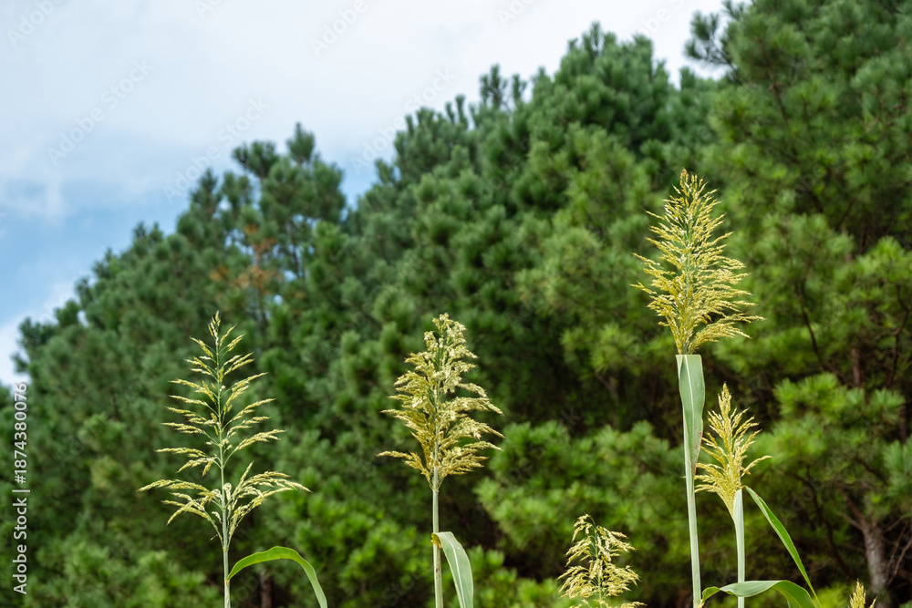 Flowering tops of cornstalks with pine trees in background
