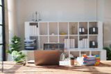 Law office desk featuring a laptop, stack of documents with colorful clips, coffee cup, and smartphone, emphasizing legal work and professional administration in a bright setting