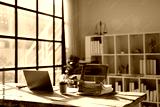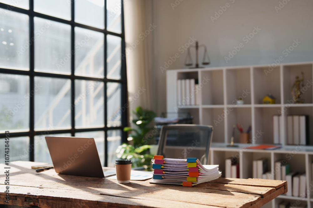 Modern law office workspace featuring a wooden desk with a laptop, stacked legal documents, and a coffee cup, with a scales of justice and bookshelves in the background