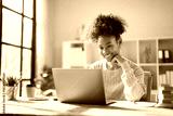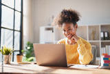 Young happy African American woman smiling while looking at a laptop screen, engaging in online work from a modern office, enjoying remote productivity