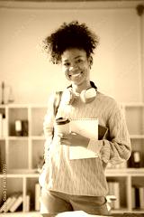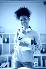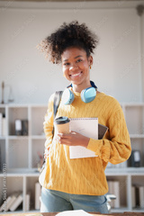 African American student standing in a bright university library or common area, holding a disposable coffee cup and an open notebook, wearing headphones around her neck and smiling at the camera