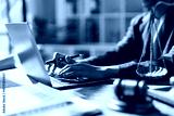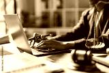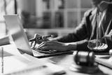 Professional legal counsel typing on laptop, reviewing documents with scales of justice and gavel on desk, symbolizing law, research, contracts and courtroom advocacy