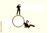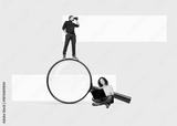 A woman with a laptop and man with binoculars on a big magnifying glass. Art collage. Searching for information on the internet concept.