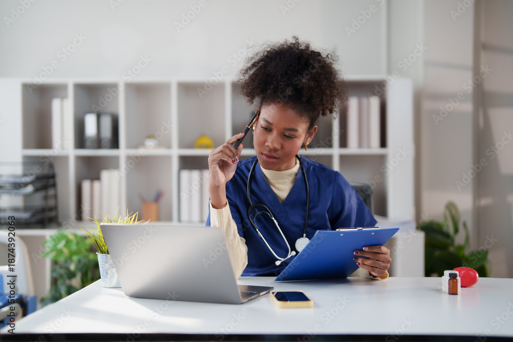 Young African American female nurse practitioner wearing scrubs and stethoscope, thoughtfully working at a desk with a laptop and clipboard in a medical office environment