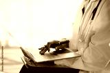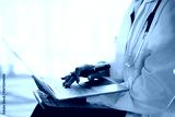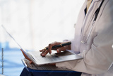 Doctor hands typing on laptop keyboard in white coat with stethoscope, close-up showing medical professional entering electronic records and using digital technology for patient care