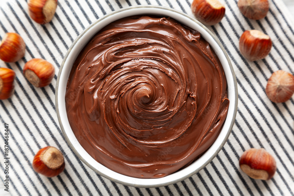 Delicious Homemade Chocolate Hazelnut Spread in a Bowl, top view.