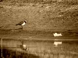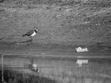Northern Lapwing or Vanellus vanellus stands by water edge near plastic bag. Northern Lapwing bird and growing pollution of environmental threats. Ecological concept, wildlife habitat degradation