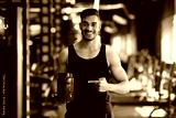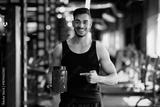 Bodybuilding Nutrition. Happy Arab Sportsman Pointing At Red Container With Whey Powder While Posing In Modern Gym Interior, Handsome Middle Eastern Athlete Advertising Fitness Supplements