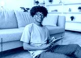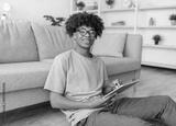 Positive black teen guy in casual wear having online lesson on tablet pc at home. African American adolescent participating in webinar, studying remotely, chatting to friend on internet
