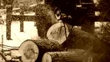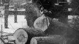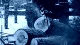 Lumberjack woodcutter with chainsaw in uniform cutting a massive tree in the winter forest, logger sawing and chopping firewood timber tree trunk on sawmill, lumberman at work, sawdust and woodchips