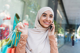 Satisfied pretty millennial arabian woman in hijab with lots of bags with new clothes, calls on phone near urban store. Happy lady enjoying shopping. Consumer protection, purchases, lifestyle concept