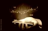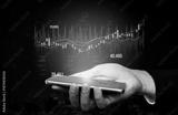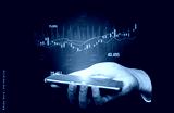 A hand holding a smartphone shows stock market data with graphs and numbers glowing against a dark backdrop, representing modern investment strategies and analysis. Scalp