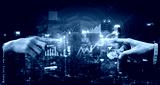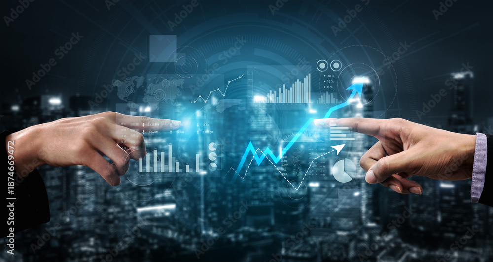 Two hands reach out in a business setting, surrounded by graphs and economic symbols, showcasing the essence of teamwork and financial progress in a modern city. Scalp