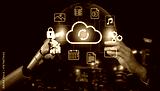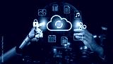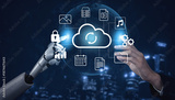 A creative representation of technology and data management featuring a robotic hand and a human hand connecting with digital cloud icons and symbols. Gantry