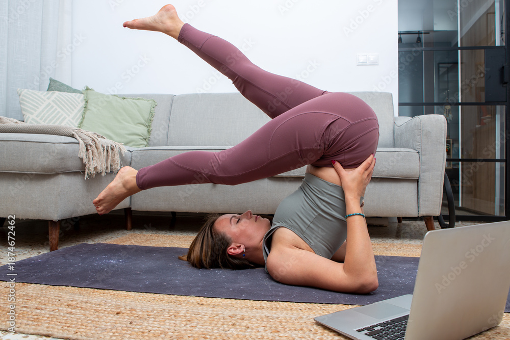 Woman Practicing Shoulder Stand Pose During Online Yoga
