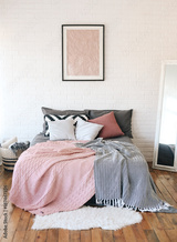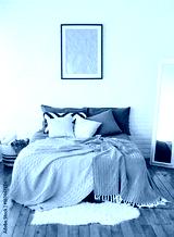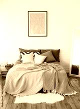 interior of bedroom using bed, mirror, pattern, textile on white brick wall background