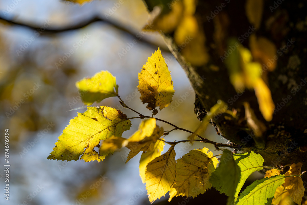 Close-up view of yellow autumn leaves in Central Switzerland, captured on a sunny day with warm light and shallow depth of field, highlighting natural textures and seasonal beauty.