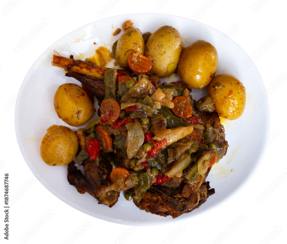 Chicken leg baked with vegetables served with side dish of boiled potatoes. Juicy chicken meat with green peas, carrots, onions and spices. Isolated over white background
