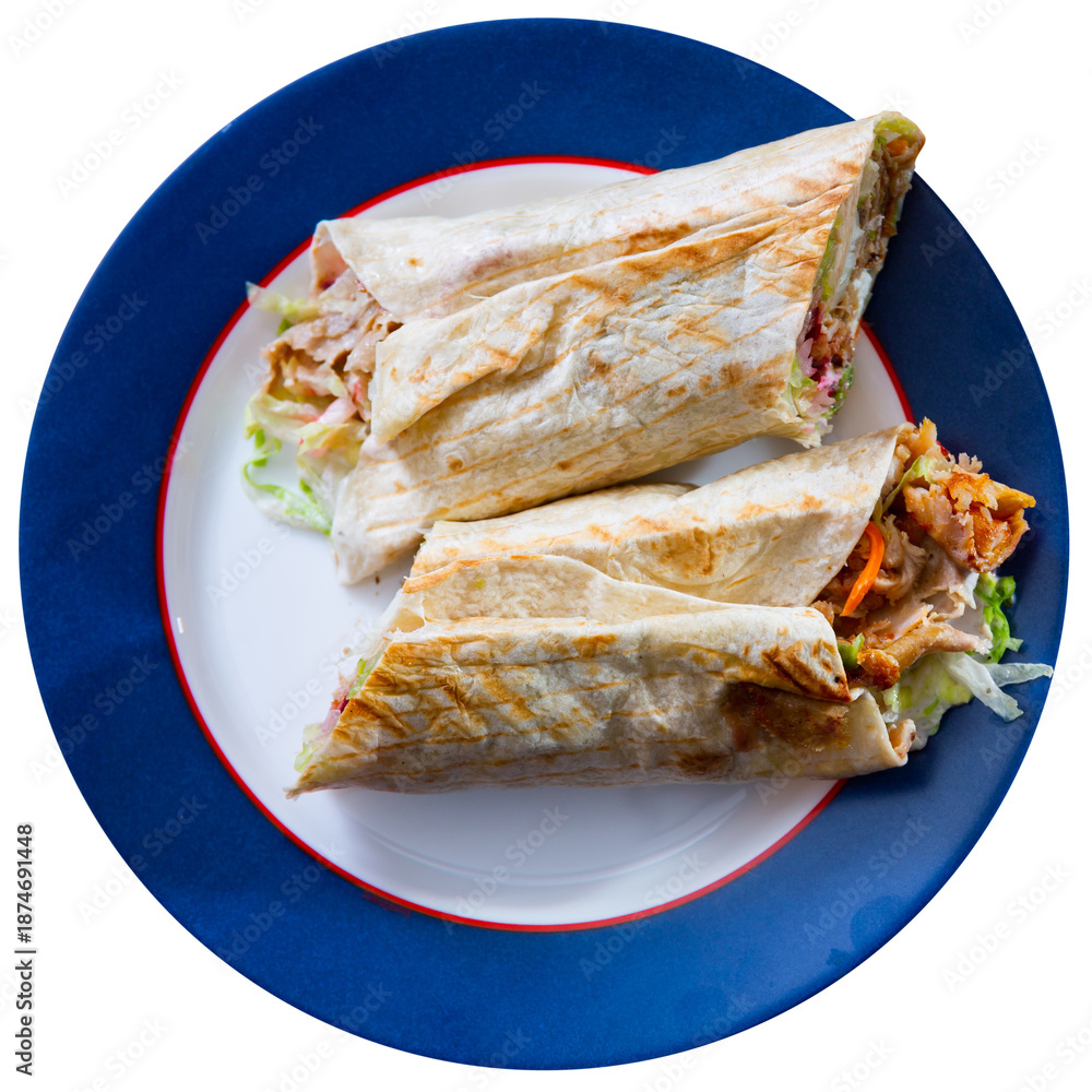 Delicious doner donair kebab wrap with meat, lettuce, tomato, red onion. Isolated over white background