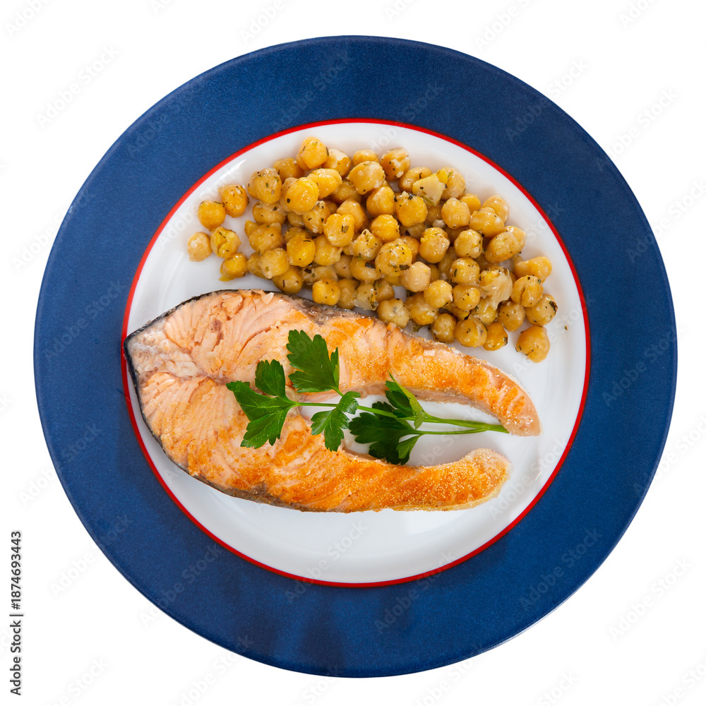 Healthy eating. Slightly fried salmon served with chickpeas. Isolated over white background