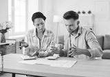 Stressed diverse mixed race couple reviews household bills and monthly expenses, using a calculator to track debt and finance, getting confused about strange figures and numbers in the account balance