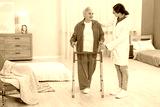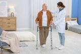 Care worker helping woman with walker at retirement home