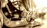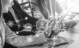 A dynamic office scene showcasing a professional team collaborating on customer relationship management, utilizing technology and data visualization to enhance efficiency and growth. Tessel
