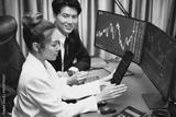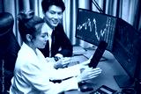 Businesswoman holding tablet on dynamic stock exchange statistic online showing to partners to share, comparing with high or low point graph on computer screen at night neon modern office. Infobahn.