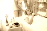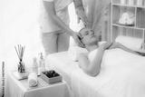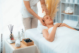 Caucasian woman enjoying relaxing anti-stress head massage and pampering facial beauty skin recreation leisure in dayspa modern light ambient at luxury resort or hotel spa salon. Quiescent