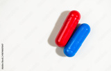 Red and Blue Pill Capsules on White Background with Strong Shadows