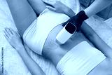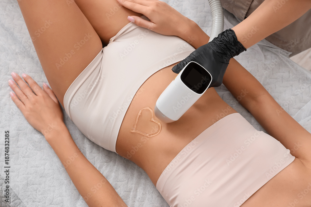 Woman's belly with heart made of gel undergoing photoepilation in beauty salon, top view